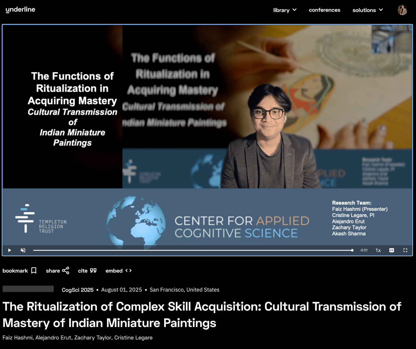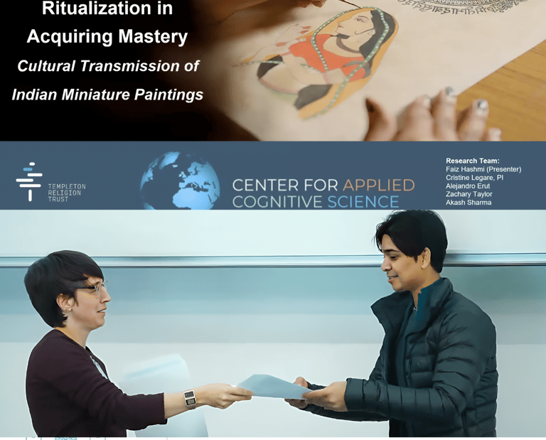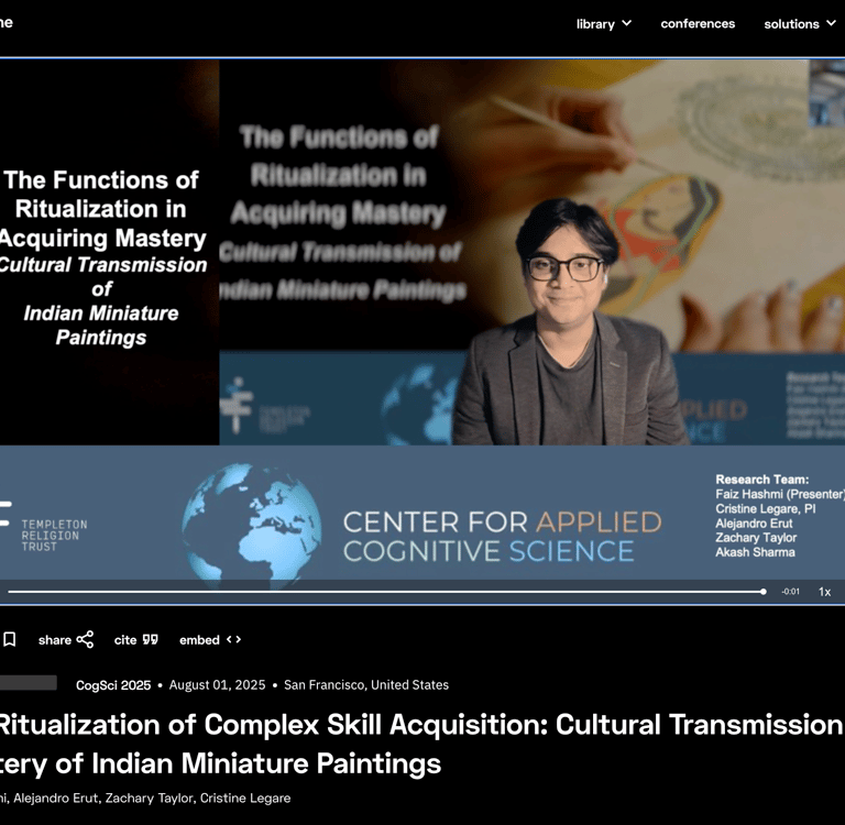 I presented this talk at CogSci 2025, showing how ritualized apprenticeship in Indian miniature painting operates as a cognitive technology for learning complex skills. Sequenced routines—pigment grinding, wasli preparation, brush micro-movements, and layered washes—reduce cognitive load, support chunking, and consolidate procedural memory. Guided imitation and corrective feedback cultivate expert attention, perceptual tuning, and shared schemas that stabilize tradition while enabling innovation. I connect these mechanisms to cumulative culture: studios, tools, and repeated rituals scaffold high-fidelity transmission across generations. My takeaway: ritual isn’t decorative—it structures attention, compresses uncertainty, and accelerates mastery. This cognitive lens also clarifies why novices progress through predictable stages and why expert gaze emerges rapidly.