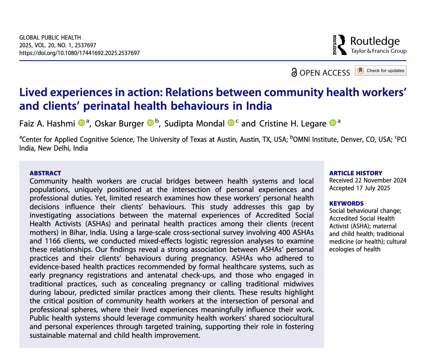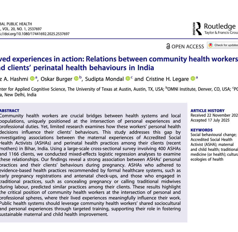 In this paper, my co-authors and I test whether community health workers’ own perinatal experiences shape client behaviors. Using survey data from 400 ASHAs and 1,166 recent mothers in Bihar, we ran mixed-effects logistic regressions linking ASHAs’ personal practices to their clients’ antenatal and birth decisions. We find that both evidence-based actions (e.g., early registration, ANC visits) and traditional practices (e.g., concealing pregnancy, calling traditional midwives) among ASHAs predict similar behaviors among mothers they serve. The results highlight a cognitive-ecological pathway—role-modeling, social learning, and shared schemas—through which lived experience influences behavior change. Training that leverages CHWs’ sociocultural proximity could strengthen maternal and newborn health programs.