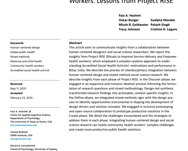 I am happy to share our new publication, 'Integrating Human-Centered Design and Social Science Research to Improve Service-Delivery and Empower Community Health Workers: Lessons from Project RISE.' Our paper presents insights from integrating human-centered design (HCD) and social science research in a project on 'Harnessing Ritual to Improve Service-Delivery and Empower Health Workers' (RISE). Focusing on Bihar, India, project RISE combined a complex systems approach with mixed-method research and HCD. We aimed to devise empirically informed solutions to augment community health work and improve maternal and child health behaviors. Our paper systematically explores the project, detailing processes, actionable insights, and the challenges encountered, from ideation to prototyping.