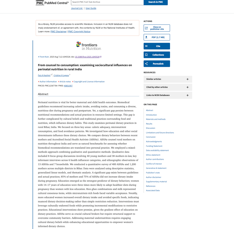 My paper examines how sociocultural beliefs shape perinatal nutrition in rural Bihar—and how counseling actually translates into what women eat. Using mixed methods (FGDs with mothers and mothers-in-law, key-informant interviews, ethnographic observations) and surveys of 400 ASHAs and 1,200 mothers, we assessed caloric change, micronutrient intake, and food-avoidance patterns. We find large gaps between guidelines and practice: 85% of mothers and 75% of ASHAs did not increase intake during pregnancy. Education is the strongest predictor—women with 14–17 years of schooling were about three times more likely to improve their diets. Culturally endorsed items (rice-ghee, milk) show consensus, while micronutrient-rich foods face variable acceptance. We recommend leveraging endorsed foods, reshaping taboos incrementally, and supporting ASHAs as cultural brokers.